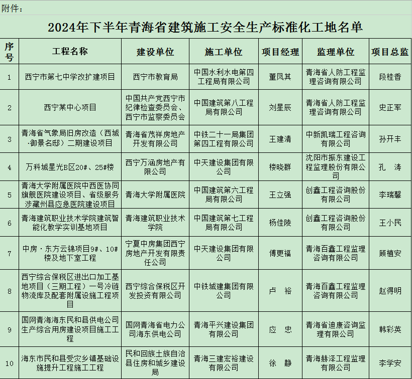 根据《青海省建筑施工安全生产标准化考评实施方案》(青建工〔2015〕87号)《2024年度“青海省建筑施工安全生产标准化工地”考评实施方案》(青建工〔2024〕142号)要求,我厅对各地推荐的建筑施工安全生产标准化工地组织专家进行了考评评定。经评定,决定对“西宁市第七中学改扩建项目”等19个建筑施工项目授予“青海省建筑施工安全生产标准化工地”称号,现予以公布(信息公开网址:http://zjt.qinghai.gov.cn),并对获得称号的省级建筑施工安全生产标准化工地施工单位、项目经理及监理单位、总监理工程师予以通报表彰。附件:2024年下半年“青海省建筑施工安全生产标准化工地”名单.xlsx